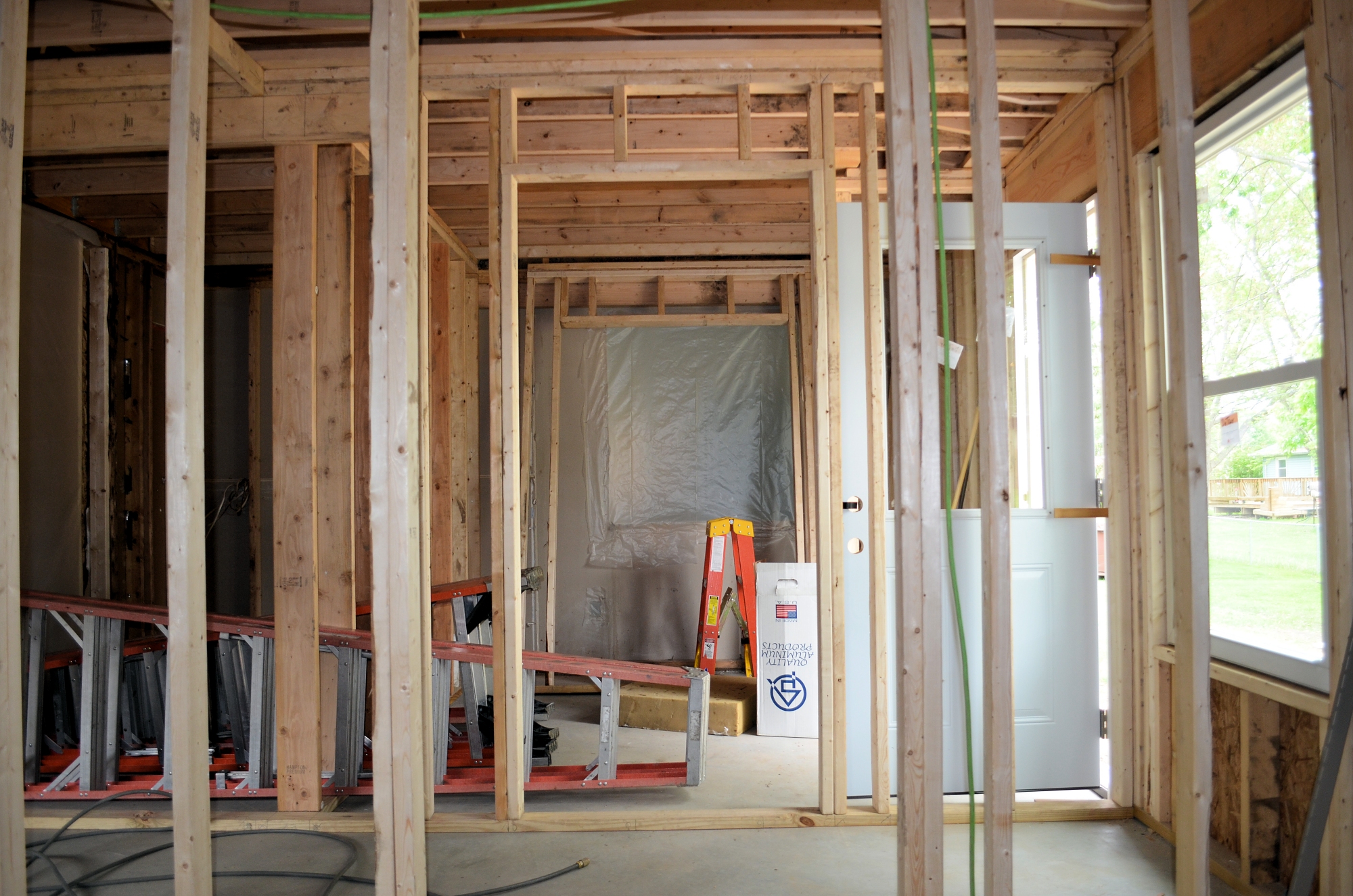 Moving inside, all of the new rooms are framed in. Just nine days ago, all we had was a concrete slab. Now we are completely under cover and have walls, a roof, partitions, doors, and windows.