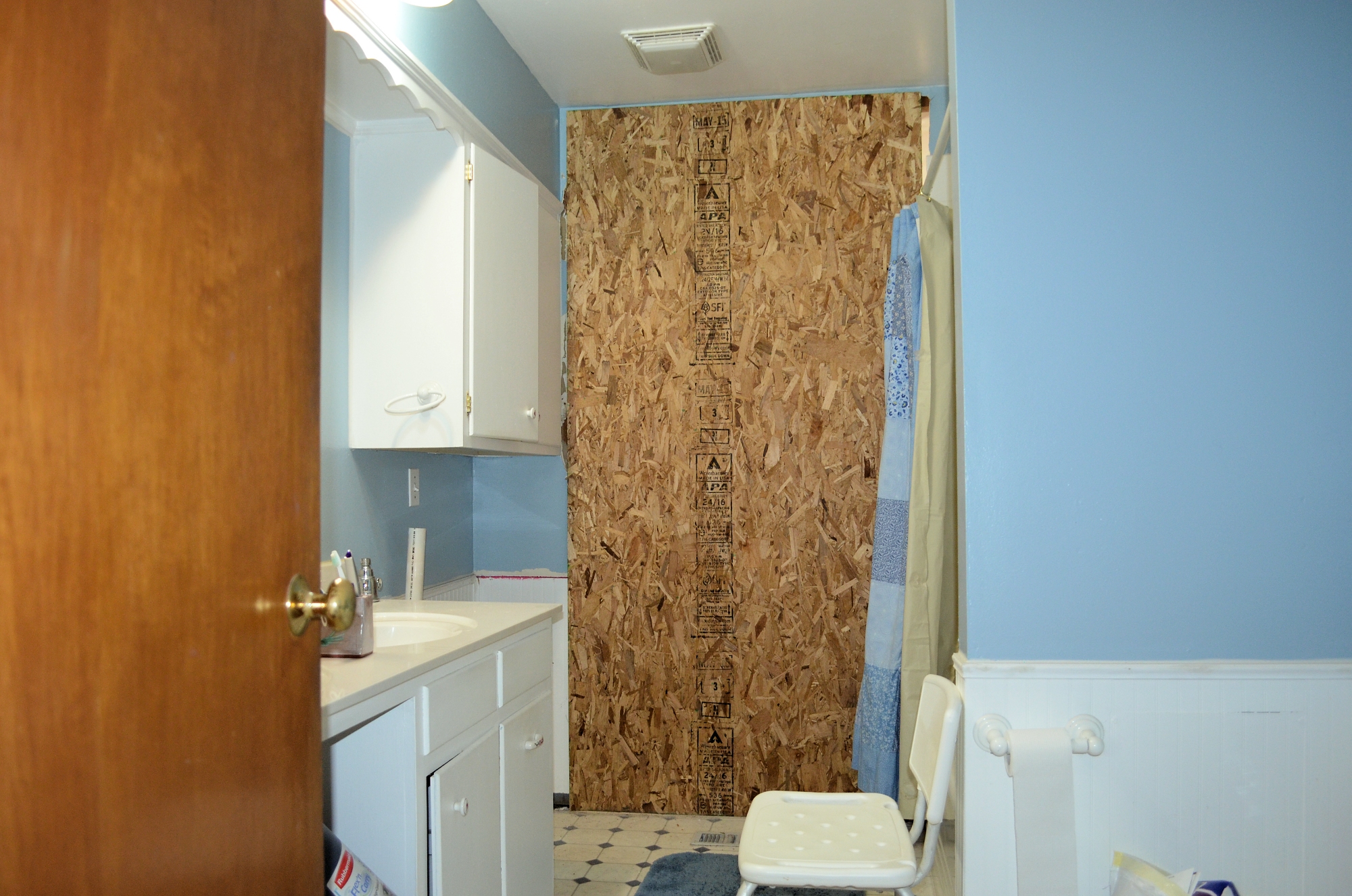 The south wall of our bathroom is gone, temporarily replaced with a lovely piece of OSB. Eventually, there will be an opening in this location that leads to our new shower room.