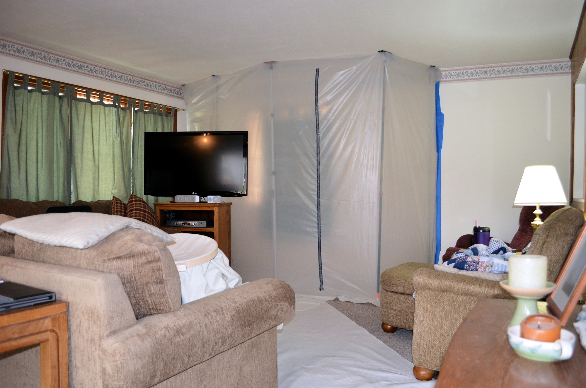 The west wall of our family room is being modified to include a pocket door into the new laundry room. This wall will also be the back wall of the new shower. The plastic barrier keeps most of the dust out of the rest of the house while the wall is rebuilt.