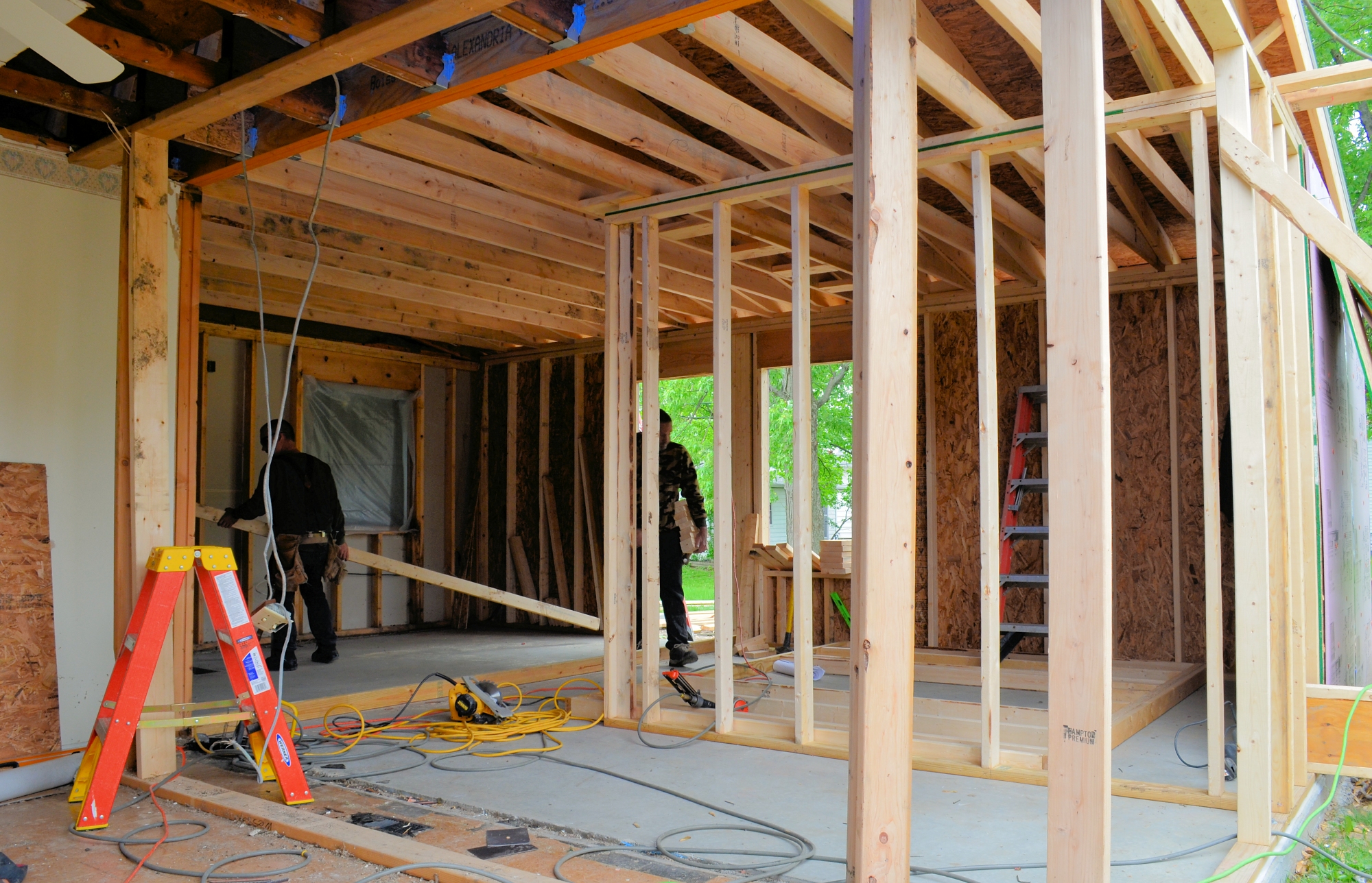 It’s cold for the middle of May — about 50° — but the framing crew doesn’t mind. It’s better than hot and muggy conditions. They’ve begun the interior framing by erecting one wall of our new walk-in closet.