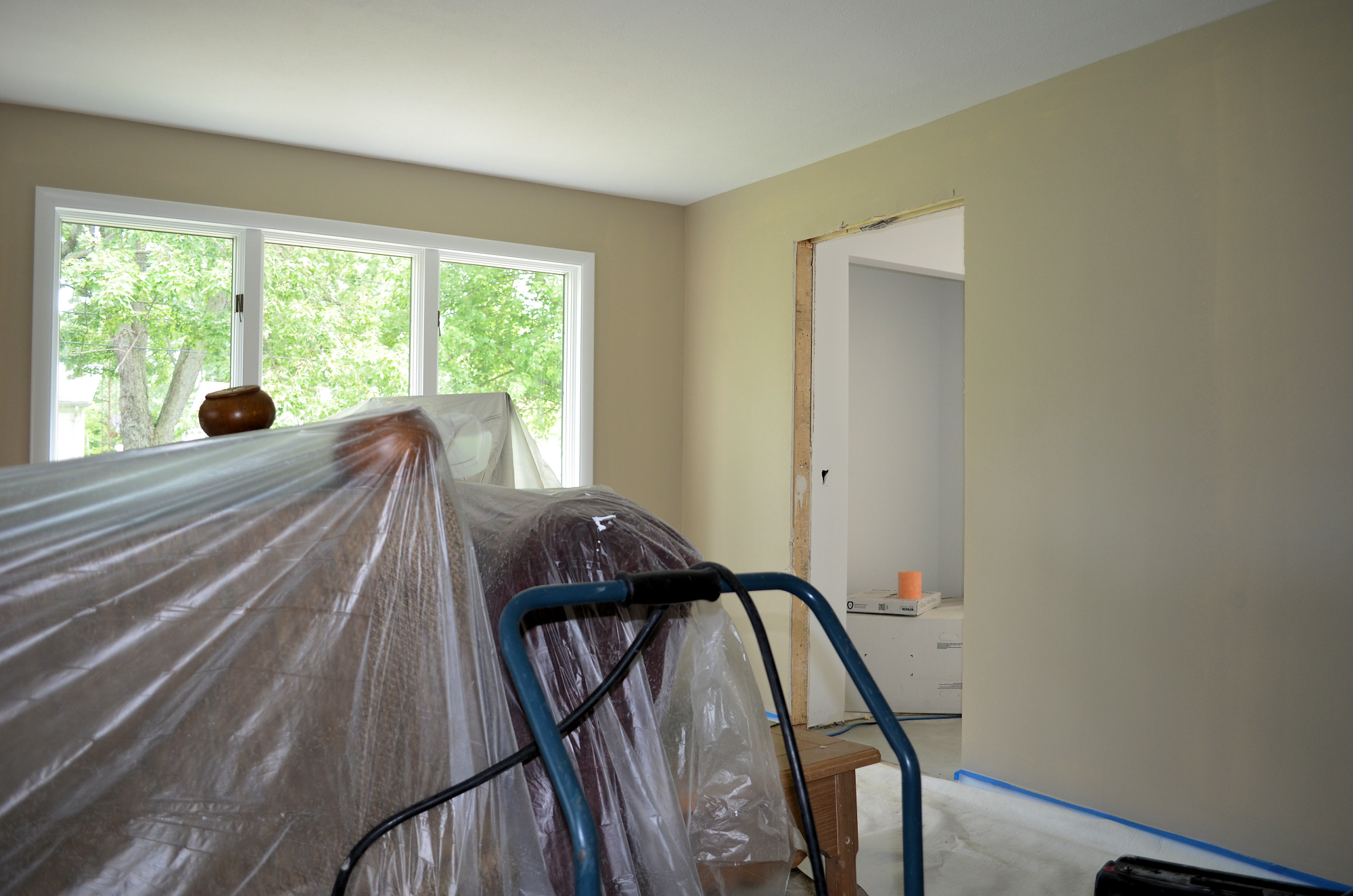 The family room got its coat of tan paint that matches our living room and dining room. And most importantly, the wallpaper border around the room is gone!