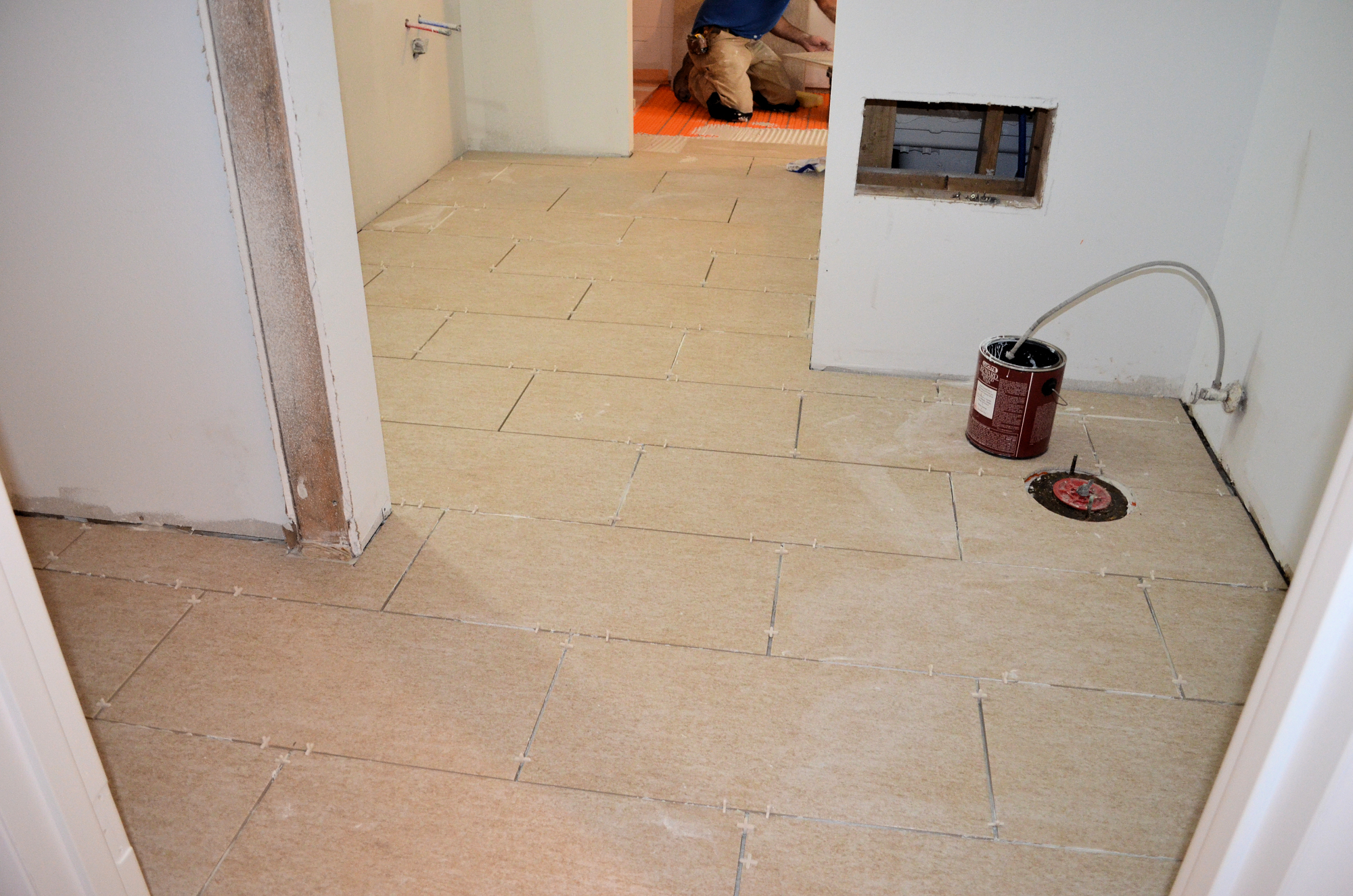 Chad started laying out tile in the bathroom and taking measurements. He consulted with us about what sort of tile pattern we wanted, something we had never even thought about! We talked it over and decided on a brick-type pattern that will be arranged so that you’ll notice it when entering the room. It’s an important factor in how the finished bathroom will look, but not something that was on our radar.
